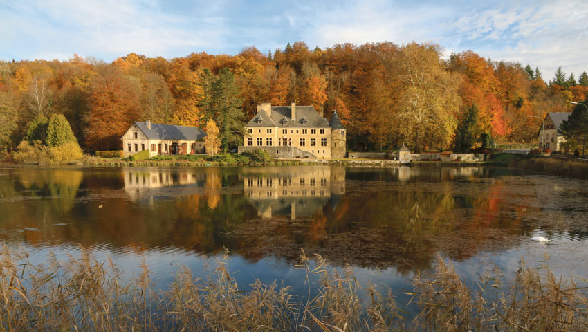 Haast paradijselijk is de route naar de abdij van Notre-Dame de Saint-Rémy, waar de trappistbieren van Rochefort worden gebrouwen. In de verte klinkt zacht gepruttel van een tractor – de enige beweging, het enige geluid in een sereen landschap waar de novemberzon een gouden glans overheen legt. Het is golvend land, groene weiden, koeien hier en daar, links de kerk van Havrenne en rechts het herfstgekleurde bos.