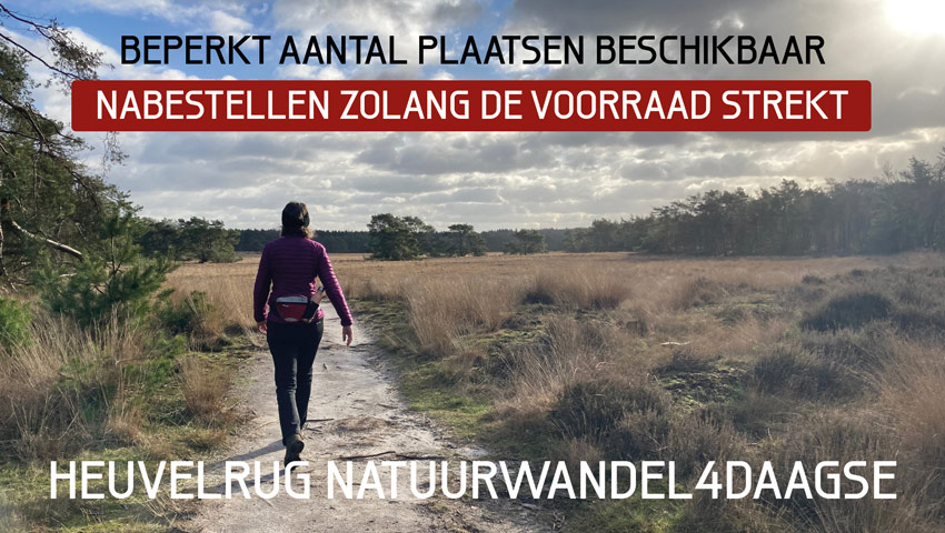 Doordat er afgeronde aantallen van de boekjes van elke afstand zijn besteld is er nog beperkte mogelijkheid tot deelname aan de Heuvelrug Natuurwandel4daagse. Kijk hieronder via de link of er op jouw favoriete afstand nog plaatsen vrij zijn. Mocht een afstand ‘vol’ zijn, kijk dan eventueel bij een andere afstand; wellicht kan je daar nog wel meedoen. Zolang de voorraad strekt is er de mogelijkheid om je alsnog aan te melden en boekje(s) en medaille(s) eveneens vóór 1 maart per post te ontvangen.