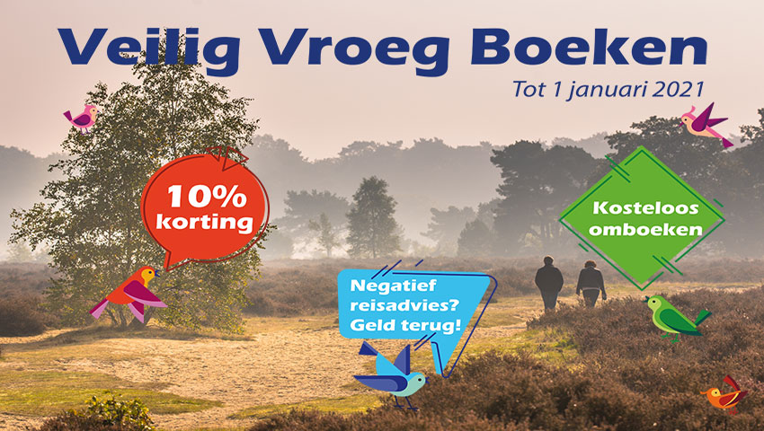 En om het helemaal aantrekkelijk te maken, krijg je nu 10% korting op je boeking en hanteren we soepele voorwaarden. Wordt er binnen 2 weken voor jouw vertrek een negatief reisadvies door de overheid afgegeven? Dan krijg je van ons je geld terug. Geen voucher maar gewoon geld terug. Bovendien kun je tot een maand voor vertrek zonder opgaaf van reden omboeken. Lekker makkelijk toch? De actievoorwaarden vind je hier.